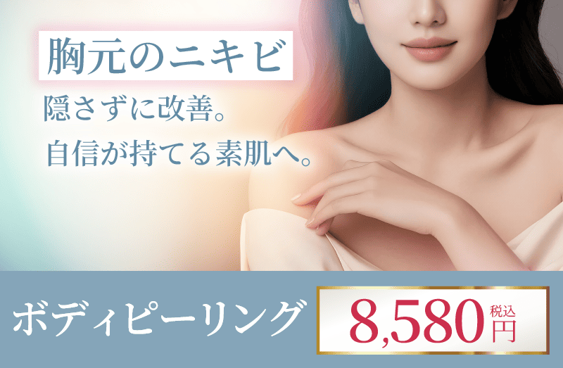 ボディ専用ピーリング剤で治りにくいボディニキビを着実に解消!体は皮膚が厚い部位もあるため、薬剤濃度や機器設定を調整し、より効果的な治療を行います。