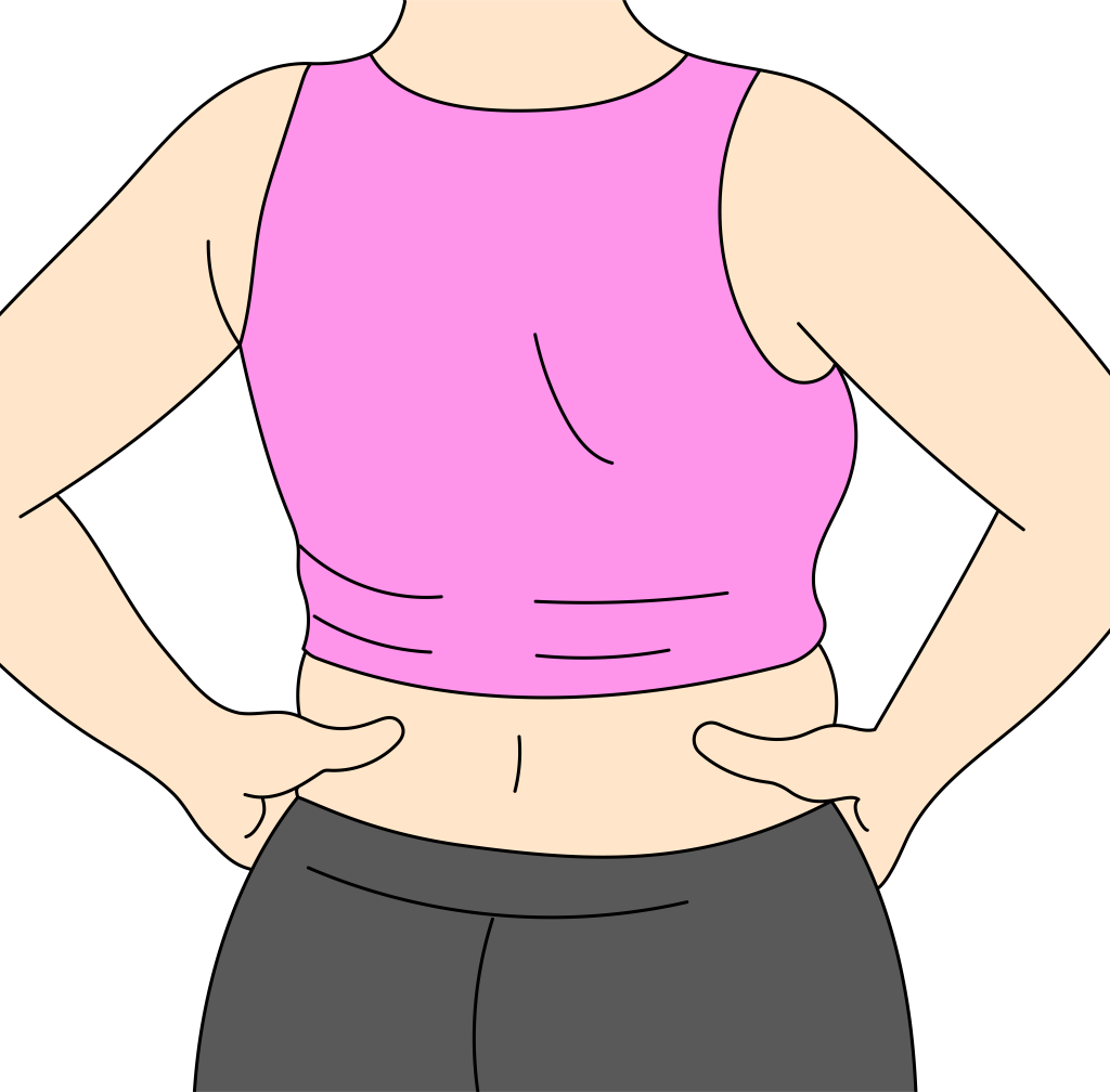 腰周りの脂肪は、主に皮下脂肪として蓄積され、特にショーツのラインの上に乗る部分に厚みが出ます。この皮下脂肪は線維質で硬い性質を持つことが多く、さらにダイエットでは落ちにくいLFD(局所脂肪沈着)も含まれることがあります。そのため、食事制限や運動だけで部分的に減らすことは非常に困難です。腰に脂肪がたくさんつくと、胴回りが太く見えるだけでなく、後ろ姿が全体的にぽっちゃりとした印象になります。