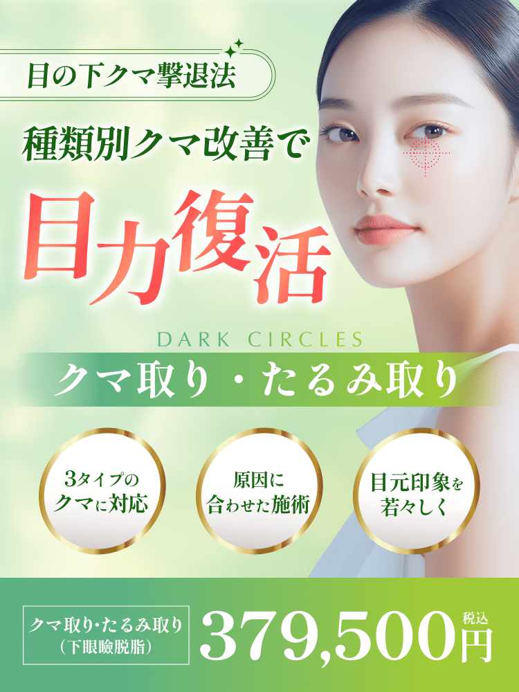 下眼瞼脱脂はまぶた裏から脂肪を除去し、たるみやふくらみを改善。若々しい表情に戻り、傷跡も目立ちにくく...1度の施術で効果を実感できます。 こんな方におすすめです。目の下のふくらみや軽度のたるみが気になる方、クマによる老け顔を改善したい方、傷跡を目立たせたくない方に適しています。 渋谷美容外科クリニックでは、開院25年・症例数40万件超の実績を誇り、渋谷、池袋、横浜、新宿、新橋の5院で展開しています。月額プランや学割、友達割引など多彩な料金プランを用意し、期間限定の特別キャンペーンやLINE限定キャンペーンも実施中です。経験豊富な医師が丁寧にカウンセリングし、安心して施術を受けられる環境を整えています。お悩みに寄り添う親身な対応も魅力です。 クマ取り・たるみ取りは、下まつ毛の裏側から脂肪を除去し、影をなくして若々しい印象に導きます。施術後は痛みや腫れ、内出血が約1〜2週間続く場合があり、目元を濡らす洗顔や飲酒は控えてください。抜糸不要で傷跡も目立ちにくく、丁寧なカウンセリングと施術で安心して受けられます。