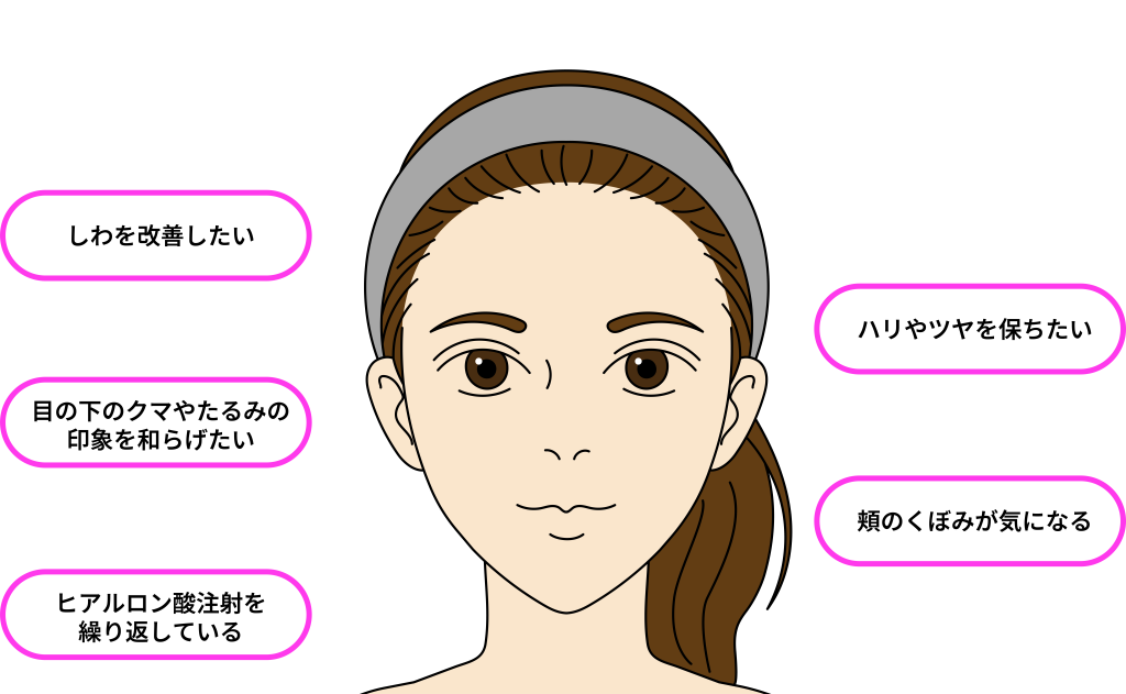 ほうれい線や目の下のくぼみ、額のシワなどを改善し、ふっくらとした若々しい印象を取り戻せます。定着すれば長期的な効果が期待でき、人工物を使わない点も安心材料です。