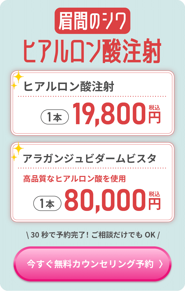 ただ、深く刻まれたシワをセルフケアで解消するのは難しいうえ、時間もかかるでしょう。早く確実に眉間のシワを改善したい方にはヒアルロン酸注射がおすすめです。