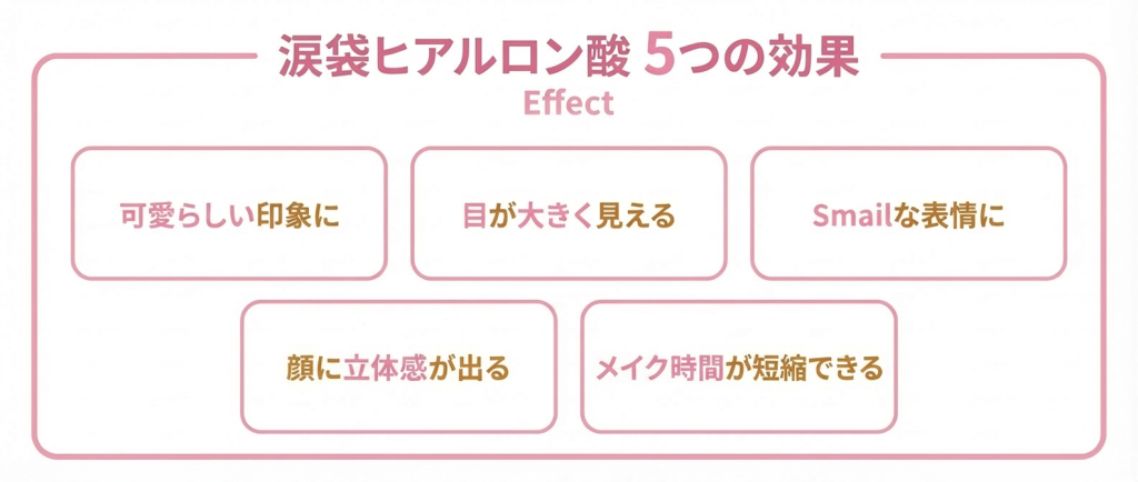 涙袋がふっくら浮き上がることでその部分が光を集め、目元が明るくなります。キラキラした目の印象を与えられるのです。