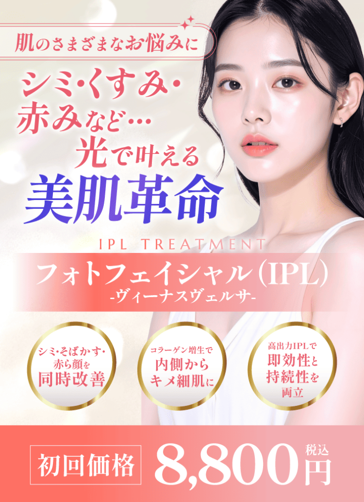 フォトフェイシャル(ヴィーナスヴェルサ)とは、IPL(インテンス・パルス・ライト)という光を肌に照射する治療のことです。