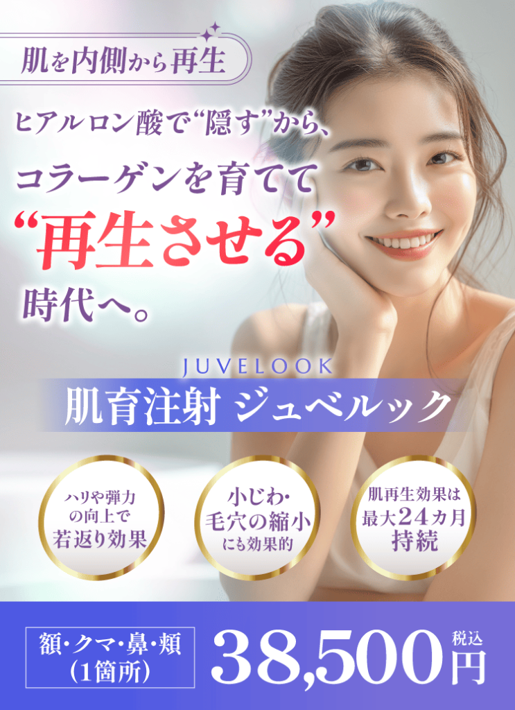 ジュベルックは、注入後すぐに変化が出るヒアルロン酸とは異なり、時間をかけて真皮層でコラーゲン生成を促すタイプのスキンブースターです。