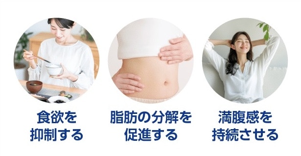 胃腸の動きを抑制して食欲を抑えるだけでなく、満腹中枢に作用し満腹感を維持する効果が期待されます。脂肪細胞の燃焼を助ける作用もあるため、無理なく自然に体重減少が見込めるでしょう。