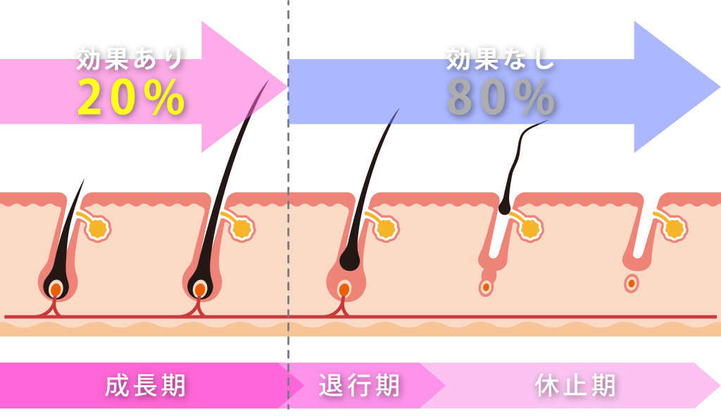毛周期には成長期、退行期、休止期の3つの段階があり、ヒゲの場合は成長期が4~12ヶ月、退行期や休止期が2~3か月です。一般的に、退行期や休止期にヒゲ脱毛をしても脱毛効果を得られません。そのうえ、脱毛効果が高い成長後期のヒゲは全体のうち、わずか10~20%しかないとされています。