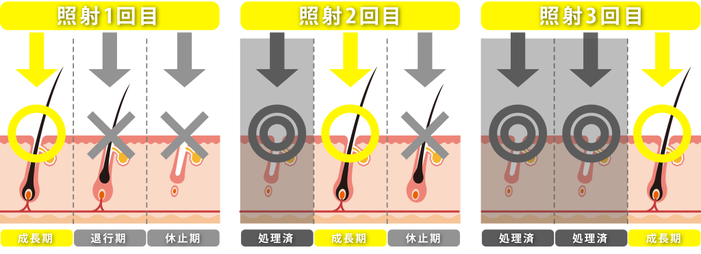 毛には毛周期と呼ばれるサイクルがあり、成長期、退行期、休止期があります。医療脱毛レーザーが反応するのは成長期の毛であり、他の毛には反応しにくいです。毛周期は個人差がありますが、ヒゲは退行期と休止期が約1カ月あると考えられているため、1カ月ごとに脱毛を受けましょう。