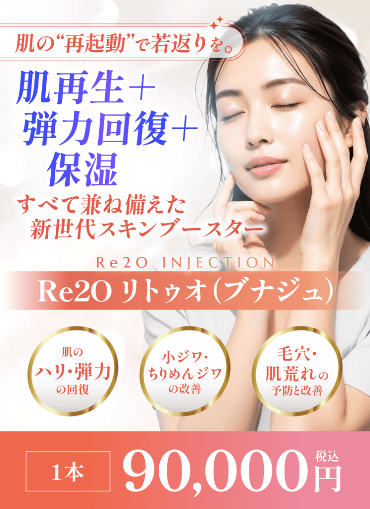 Re2O リトゥオ(ブナジュ)は、クリニックごとに注射・マイクロニードル・導入機器など複数の施術方法に対応。肌質やお悩みに合わせたカスタマイズが可能です。