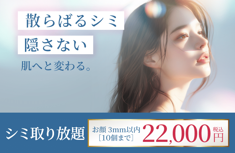 当院では顔全体最大10箇所のシミ取り放題プランをご用意!3mm以内のシミが通常価格の約40%OFFで治療できます。