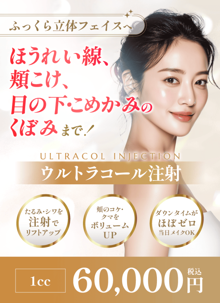 ウルトラコール注射は、メスを使わずに目元や顔のボリュームロス、たるみ、小ジワを改善できる再生型美容注射です。