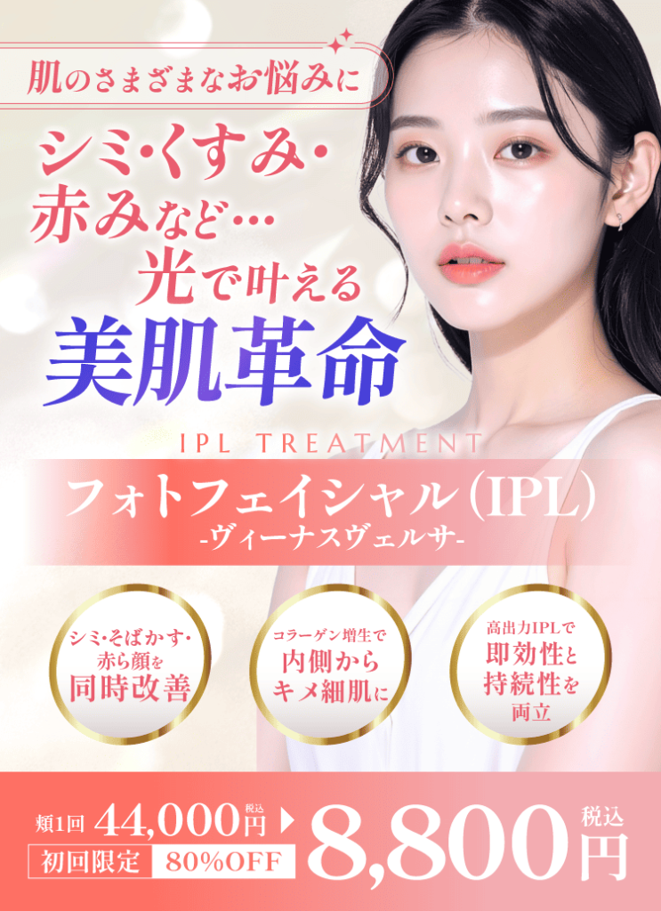 フォトフェイシャル(ヴィーナスヴェルサ)とは、IPL(インテンス・パルス・ライト)という光を肌に照射する治療のことです。
